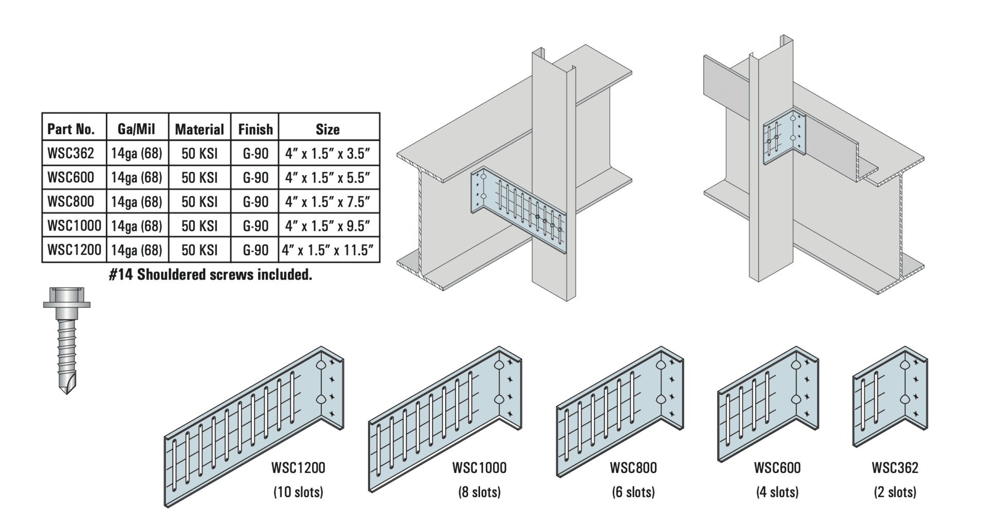WSC Slide clips connect exterior curtainwall studs to the building structure and allow for vertical movement of the building independent of the studs. The new WSC series allows for 3? total deflection, 1-1/2? up and 1-1/2? down. WSC series 14 ga. clips come with extended leg lengths and a bag of shouldered screws in each box of clips.