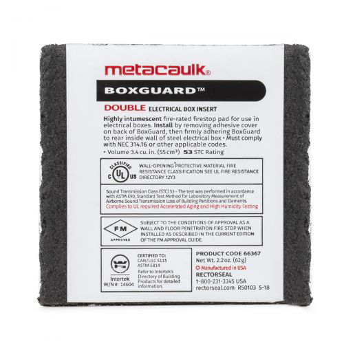 Metacaulk Box Guard is a 1-component fire-rated pad for use in electrical boxes. When exposed to fire, it will expand forming a char that seals the opening, prevents spread of flames & limits temperature rise on unexposed surfaces.
