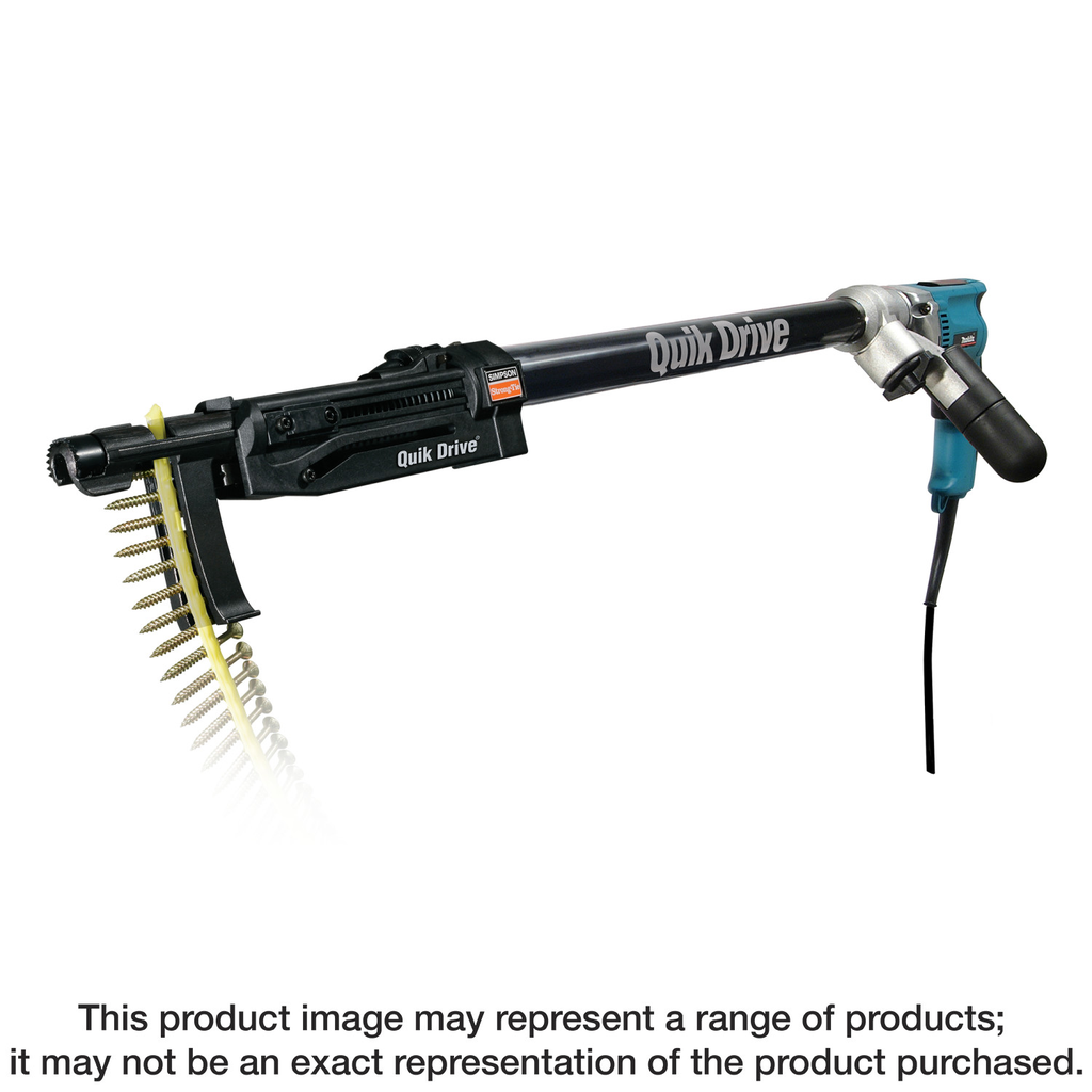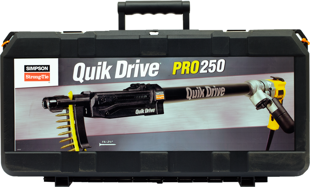 The Simpson Strong-Tie PRO250G2D25K Quik Drive® PRO250G2 Subfloor System is engineered for efficient performance in subfloor applications, featuring an advanced DeWalt® 2500 RPM screwdriver motor that ensures powerful driving capabilities. This system boasts expanded depth settings, allowing for precise countersinking suitable for a variety of surfaces, while its reversible non-skid teeth attachment aids in uniform toenailing across slick materials. Designed for ease of use, the patented curved collation strips keep screws positioned above the work surface for effortless tool maneuverability, and they facilitate a straightforward loading process thanks to their pointed ends. Complete with the essential subfloor attachment, a handy extension for stand-up driving, a screw quiver, and a rugged tool case, this comprehensive system is indispensable for professionals seeking reliability and efficiency in their work.