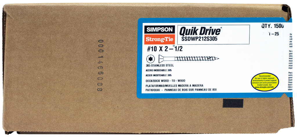 Engineered for exceptional performance and durability, the Simpson Strong-Tie Deck-Drive DWP Wood SS Screws are a must-have for any decking project. Constructed from Type 305 stainless steel, these collated screws ensure long-lasting resistance to corrosion, making them ideal for outdoor use. The unique box thread design, featuring raised-ridge technology, minimizes driving torque and enhances ease of installation, while the specially designed sharp point effortlessly penetrates tough wood products. Additionally, with the inclusion of three T25 6-lobe driver bits, you’ll experience reduced cam-out and extended bit life, facilitating a smooth and efficient driving process. Perfectly suited for serious builders and DIY enthusiasts alike, these screws combine strength with an innovative design that meets various decking requirements.