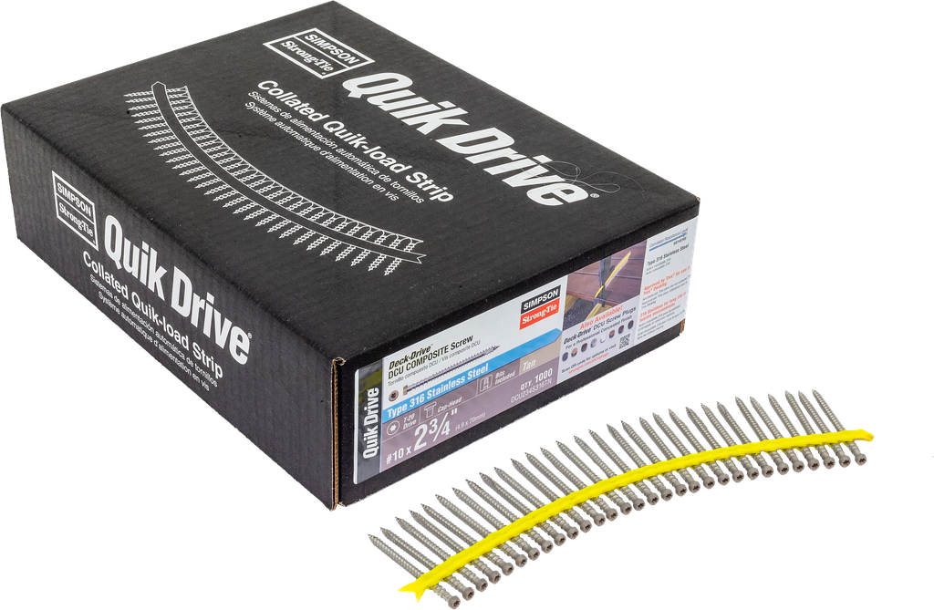 For composite or PVC decking. The Deck-Drive DCU Composite screw is engineered to provide beautiful fastening results for all types of composite decking while also offering greater ease of installation, a clean finish and superb corrosion resistance. The Deck-Drive DCU is the go-to-screw for all your composite decking applications, eliminating the need to mix and match screws to the decking they are suited for. Available with color-matching painted heads to blend with popular decking manufacturers and to provide a more concealed finish.