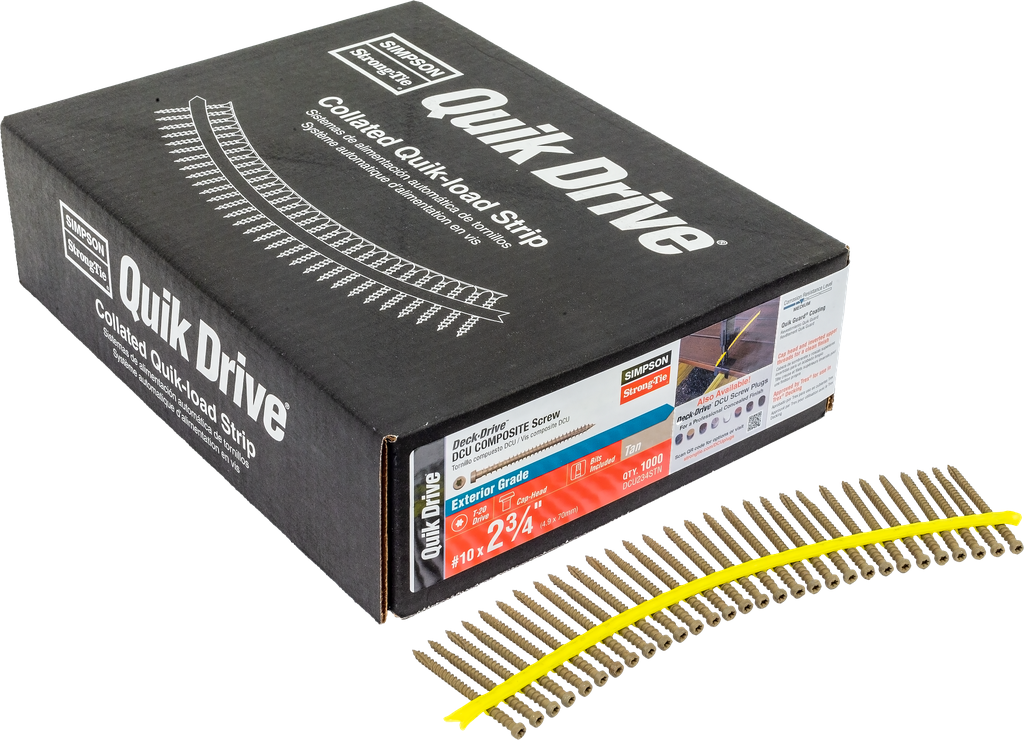 Elevate your decking projects with the Simpson Strong-Tie Deck-Drive™ DCU Composite Screws, featuring a convenient collated design for easy use. These #10 x 2-3/4 inch screws are specifically engineered for composite decking materials, allowing a seamless installation process thanks to the Type-17 point that penetrates quickly and easily. The innovative inverted upper threads help clear excess debris, ensuring that each screw is seated perfectly for a consistent finish. Additionally, the cap head design minimizes material displacement, resulting in a smooth, clean look that enhances the overall aesthetics of your deck. With corrosion resistance comparable to hot-dip galvanization, these screws are suitable for pressure-treated lumber and warrant a reliable solution for both professional and DIY applications.