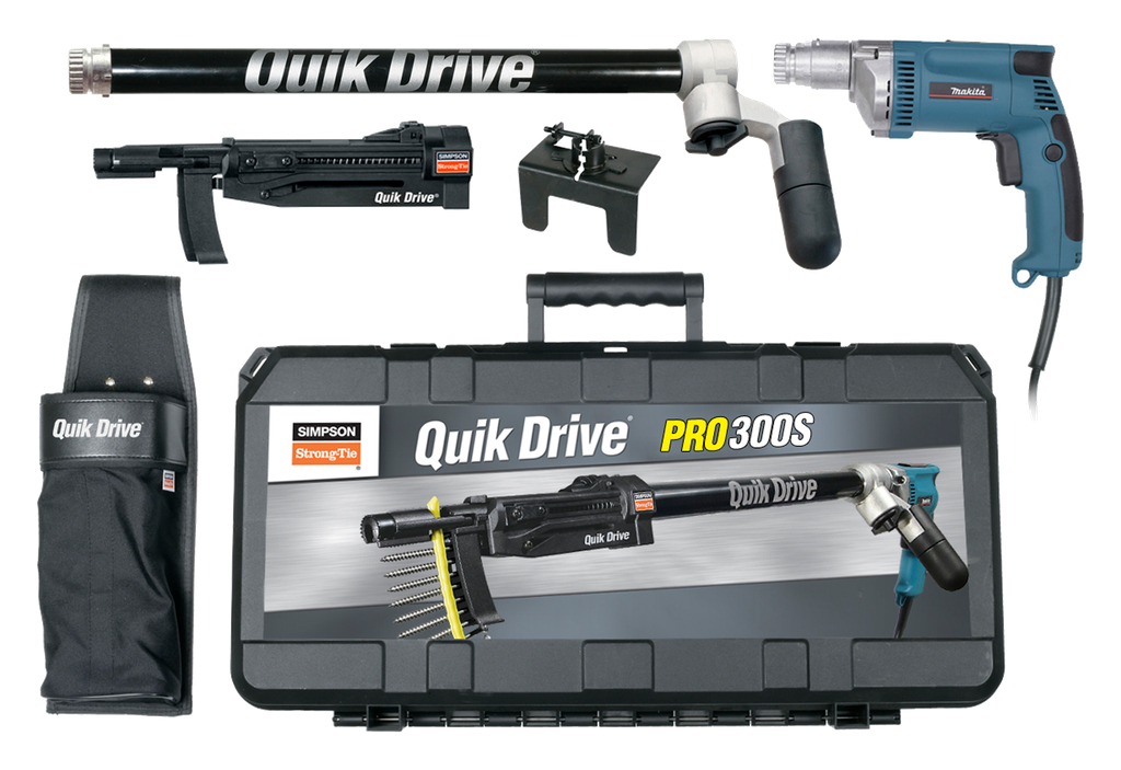 Engineered for both efficiency and precision, the Simpson Strong-Tie PRO300SM25K Quik Drive® PRO300S Decking System is a comprehensive solution for deck installation. It features a sure-grip guide tube that enhances stability, accommodating a wide variety of screws for versatile applications. The system boasts expanded depth settings, perfect for high-density flooring materials, ensuring uniform toenailing and countersinking even on slick surfaces.