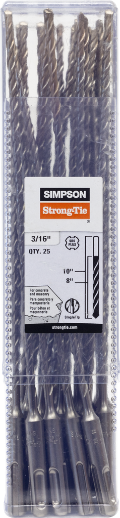 Engineered for high performance, this drill bit from Simpson Strong-Tie is built with a chromium-nickel-molybdenum steel alloy, providing exceptional durability and hammering quality for extended service life. Its chisel-shaped head is designed to penetrate tough materials efficiently while the multi-flute spiral enhances drilling speed by channeling concrete dust away from the hole. Heat-treated for increased surface hardness and featuring uniformly brazed carbide inserts, the bit significantly reduces wear and improves resistance to bending forces. With a diameter of 3/16 inches and an overall length of 10 inches, it adheres to ANSI Standard B212.15, making it a reliable choice for both professional and DIY applications.