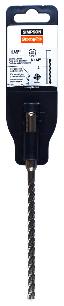 The Simpson Strong-Tie 1/4 in. x 6-1/4 in. SDS-plus® Shank Solid-Tip Carbide Drill Bit is engineered for high performance and exceptional durability during concrete drilling tasks. Its solid-tip carbide construction, enhanced by carefully controlled heat treatment and a shot-peened finish, boosts surface hardness and prolongs the life of the bit while minimizing wear and bending forces. Designed with a chisel-shaped tip, this drill bit effectively penetrates concrete, while its high-volume multi-flute spiral efficiently channels dust away from the hole, translating to faster drilling speeds. With a body made from a robust chromium-nickel-molybdenum steel alloy, this bit meets ANSI Standard B212.15 requirements, ensuring quality and reliability for various drilling applications.