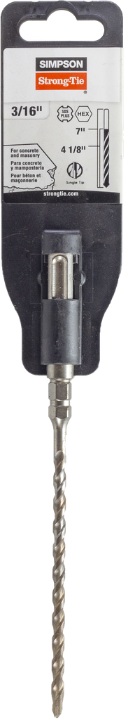 Engineered for enhanced drilling performance, the 3/16 in. x 7 in. SDS-plus® Titen® Screw Drill Bit/Driver by Simpson Strong-Tie combines precision and durability. Crafted from a chromium-nickel-molybdenum steel alloy, this drill bit features a heat-treated finish that enhances surface hardness and reduces wear, ensuring a long service life. The chisel-shaped head is designed to penetrate materials efficiently while the high-volume, multi-flute spiral quickly channels concrete dust away from the hole, significantly improving drilling speed. With uniformly brazed carbide inserts, this bit meets ANSI standard B212.15, showcasing its reliability and quality for any construction or renovation project.