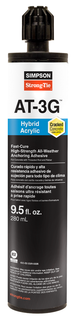 Simpson Strong-Tie® AT-3G™ is a hybrid, acrylic-based adhesive for anchoring threaded rod and rebar into cracked and uncracked concrete. Ideal for cold weather and wet concrete applications, AT-3G dispenses easily and offers a fast curing time for same-day bolt up. It can be specified for a wide range of in-service temperatures, and maintains its strong bond strength in extreme environments for ultimate design and jobsite flexibility. Tested and code compliant with the IBC and IRC, AT-3G hybrid adhesive is easy to install with the conventional blow-brush-blow hole cleaning method.