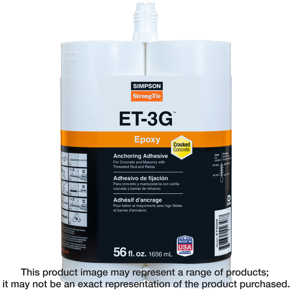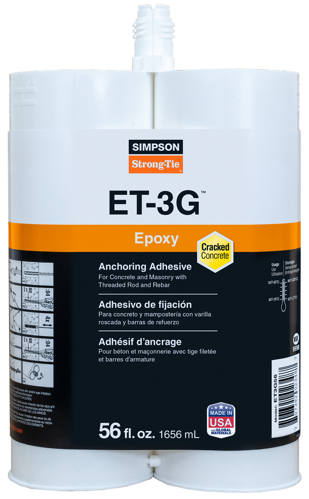 Simpson Strong-Tie® ET-3G™ is a two-component, high-solids, epoxy-based system ideal for general anchoring of threaded rod and rebar into concrete (cracked and uncracked) and masonry (cracked and uncracked). ET-3G has a long working time — 50 min at 70°F (21°C), and can be applied in dry or damp conditions. The adhesive is a teal color when mixed properly and has a substrate installation temperature range from 50°F (10°C) to 110°F (43°C). Simpson Strong-Tie epoxy anchors for concrete and masonry are rigorously tested to meet IBC requirements, including for both cracked and uncracked concrete applications.