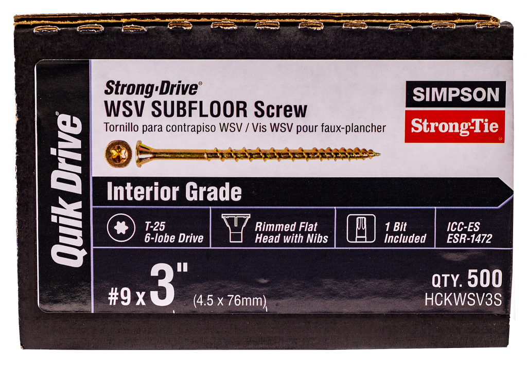Simpson Strong-Tie® Strong-Drive structural fasteners are engineered and extensively tested to efficiently meet your most demanding wood and metal applications. The Strong-Drive family is designed to install easier than other fastening methods, which saves time and money. The WSV Subfloor screw was developed for fastening subfloor sheathing using the Quik Drive® auto-feed screw driving system. It has been re-engineered to reduce driving force and increase installation speed.