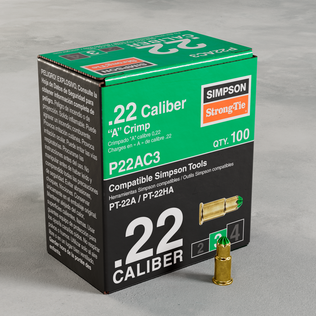 Experience reliable performance with the 0.22-Caliber “A” Single-Shot Crimp Loads from Simpson Strong-Tie. Designed for use with Simpson Strong-Tie® powder-actuated tools and compatible with many major brands, these crimp loads offer versatility and efficiency for a variety of construction tasks. Rated at power level green (3), they ensure effective fastening with a depth of 0.27 inches, making them suitable for multiple applications in both residential and commercial settings. Please note that this product may expose users to wood dust, a substance recognized by the State of California as a potential carcinogen. For responsible use, detailed information is available at www.P65Warnings.ca.gov.
