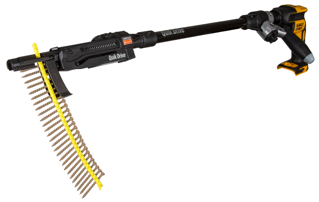 Simpson Strong-Tie® Quik Drive® cordless auto-feed screw driving systems are equipped with powerful DeWalt cordless 2,000 rpm brushless driver motors and a lightweight extension for efficient and ergonomic stand-up driving. No cords. No trips. No errors. Combined with Simpson Strong-Tie low-torque fasteners, these cordless Quik Drive systems deliver more screws — faster — per battery charge. Now available at a great value without the charger and batteries you already own.
