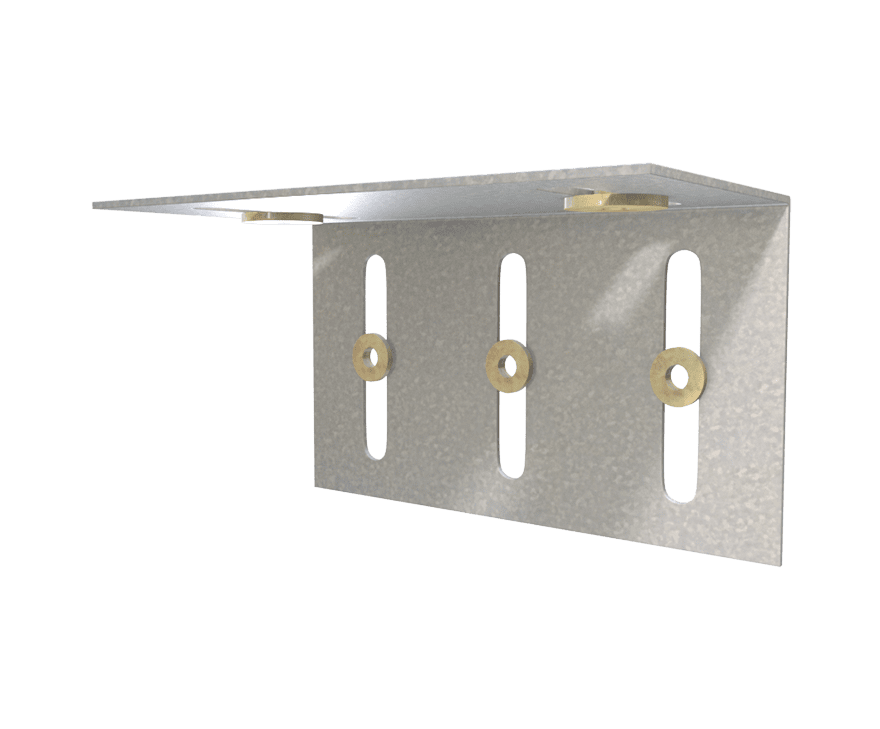 This drift slide angle is used to connect exterior cold-formed steel curtain wall studs to the slab at the head of wall, while allowing for 2” vertical deflection (1” up and down) and 2” lateral drift (1” left and right-in-plane). TSN’s patented Step Bushing Technology provides an anti-friction and anti-seizure connection between the clip and both the stud web surface & track.