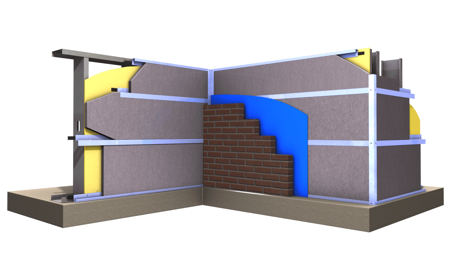Recent changes in the IECC Energy Conservation Code and ASHRAE Standard 90.1 necessitate the installation of 1 to 4 inches of continuous rigid insulation layer on the outside surface of exterior metal stud walls. Existing building component systems lack sufficient accommodation for cladding assemblies, like cement board panels, siding, metal panels, EIFS, stucco, etc. since there is no viable means to attach to a stable substrate like plywood or gypsum sheathing over the thick rigid insulation layer other than long and unstable cantilevered screws. The ThermaFast Rigid Insulation Framing System is an engineered installer-friendly set of steel framing tracks and angles designed to be an integral part of the continuous rigid insulation, and at the same time provide a stable component for direct substrate attachment.