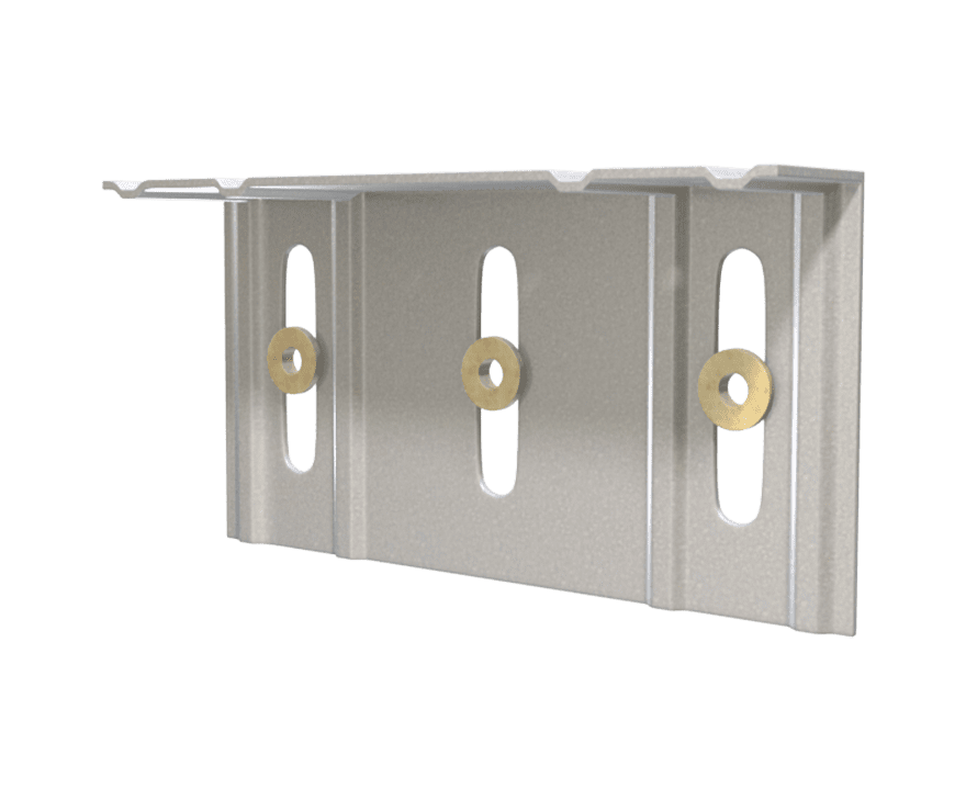 This slide angle clip is used to connect exterior cold-formed steel curtain wall studs to the primary structure at the head of wall, while allowing for vertical deflection of the structure up to 1 ½” (¾” up & down) or 3? (1 ½” up and 1 ½” down). TSN’s patented Step Bushing Technology provides an anti-friction and anti-seizure connection between the clip and the stud web surface.