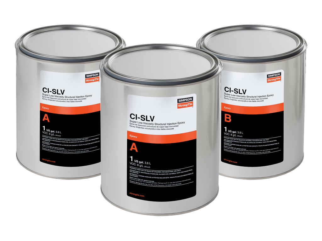 CI-SLV Super-Low-Viscosity Structural Injection Epoxy is a two-component, high-modulus, high-solids, moisture-tolerant epoxy specially designed for pressure injection, gravity feeding and flood coat filling of concrete cracks when substrate temperatures are between 60°F (16°C)–90°F (32°C). Available in 3-gallon bulk kits or convenient side-by-side cartridges dispensed through a static mixing nozzle using either a manual or pneumatic dispensing tool.