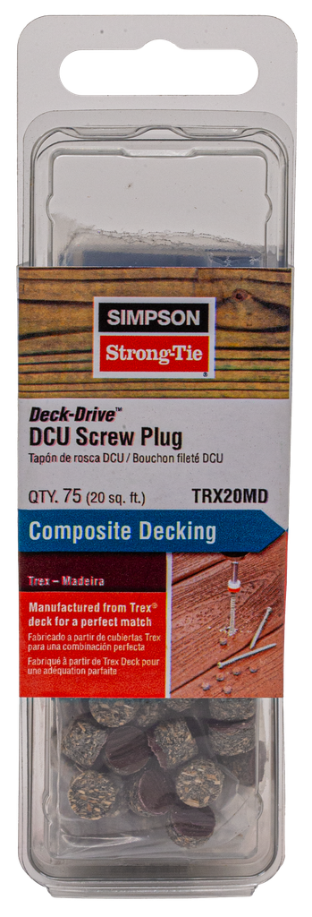 Fastening deck boards and trim can result in visible screws which can distract from the beauty of your outdoor project. The Simpson Strong-Tie® Deck-Drive DCU screw plug solution is a complete Hidden Deck-Fastening System™ designed for use with our premium DCU Composite screws and consists of DCU Composite screws, DCU screw plugs and the Auto-Set Driver™ bit (each sold separately). The DCU screw plugs are made from major composite and PVC board manufacturers’ materials to match your deck and trim boards. No more visible screw heads — a clean, professional finish.