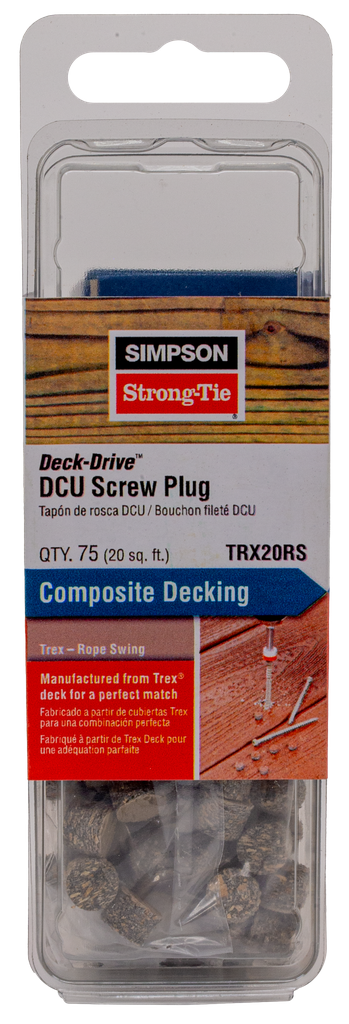 The Simpson Strong-Tie TRX20RS Deck-Drive™ DCU Screw Plug in Trex Rope Swing is designed specifically to provide a seamless and polished look for your decking projects. Manufactured from Trex decking material, these plugs not only match the color and texture perfectly but also offer excellent resistance to weathering, ensuring durability in outdoor conditions. Their tapered design facilitates easy insertion while effectively concealing screw heads, contributing to a clean and refined appearance. Compatible exclusively with Simpson Strong-Tie Deck-Drive DCU Composite screws, this package contains 75 plugs, making it a practical addition for various installations.