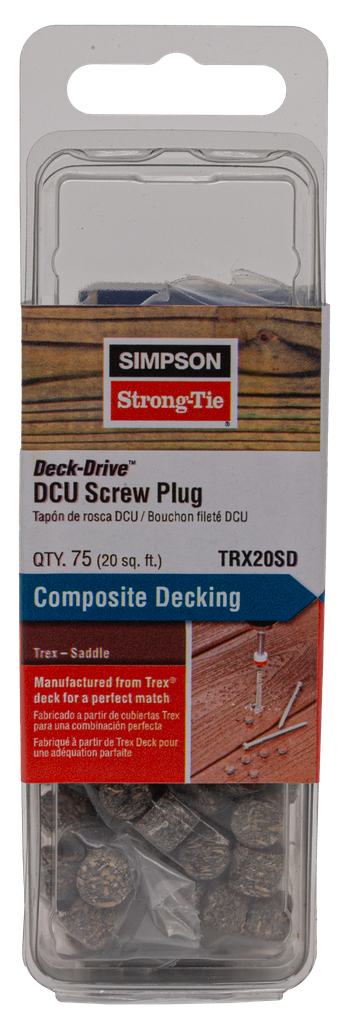 Crafted specifically for use with Simpson Strong-Tie Deck-Drive DCU Composite screws, the TRX20SD Deck-Drive™ DCU Screw Plug provides a perfect solution for achieving a seamless and polished finish on your decking projects. Manufactured from Trex Deck material, these plugs ensure a precise color and texture match, enhancing the overall aesthetic while offering exceptional resistance to weathering. Their tapered design facilitates easy insertion and helps to conceal screw heads, resulting in a clean appearance that complements your outdoor space. Note that this product contains chemicals known to the State of California to cause cancer, so please review safety information accordingly.