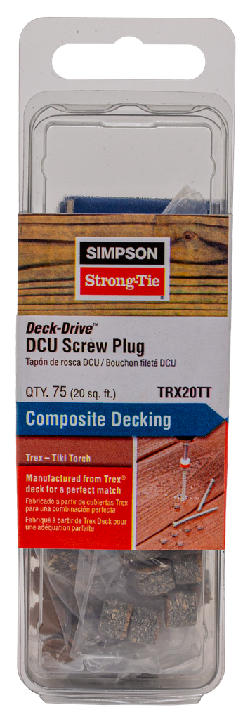 Fastening deck boards and trim can result in visible screws which can distract from the beauty of your outdoor project. The Simpson Strong-Tie® Deck-Drive DCU screw plug solution is a complete Hidden Deck-Fastening System™ designed for use with our premium DCU Composite screws and consists of DCU Composite screws, DCU screw plugs and the Auto-Set Driver™ bit (each sold separately). The DCU screw plugs are made from major composite and PVC board manufacturers’ materials to match your deck and trim boards. No more visible screw heads — a clean, professional finish.