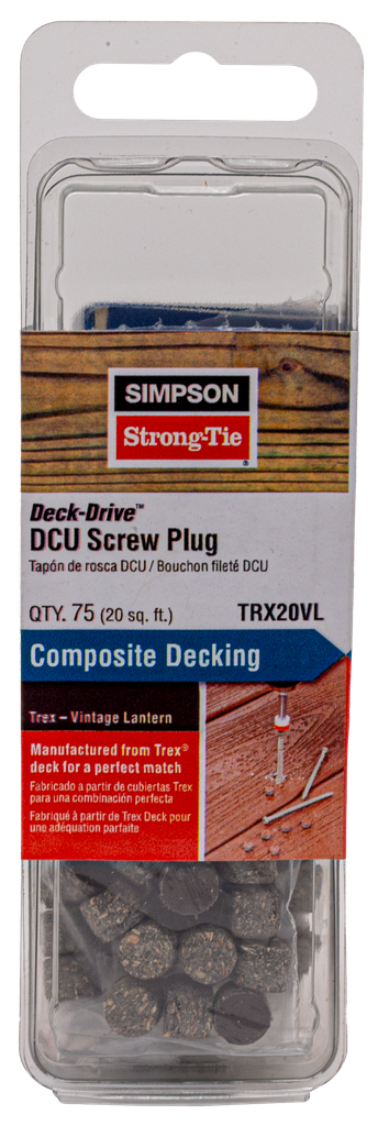 The Simpson Strong-Tie TRX20VL Deck-Drive DCU Screw Plug in the exquisite Trex Vintage Lantern color is designed specifically to complement your composite decking seamlessly. Crafted from Trex Deck material, these plugs provide not only perfect color and texture matching but also added resistance against weathering, ensuring durability over time. With a tapered design for easy insertion, these screw plugs effectively conceal screw heads, offering a sleek, polished look that enhances the overall aesthetic of your deck. Designed for use exclusively with Simpson Strong-Tie Deck-Drive DCU Composite screws, this set of 75 plugs combines functionality and visual appeal, making it a thoughtful choice for any decking project.